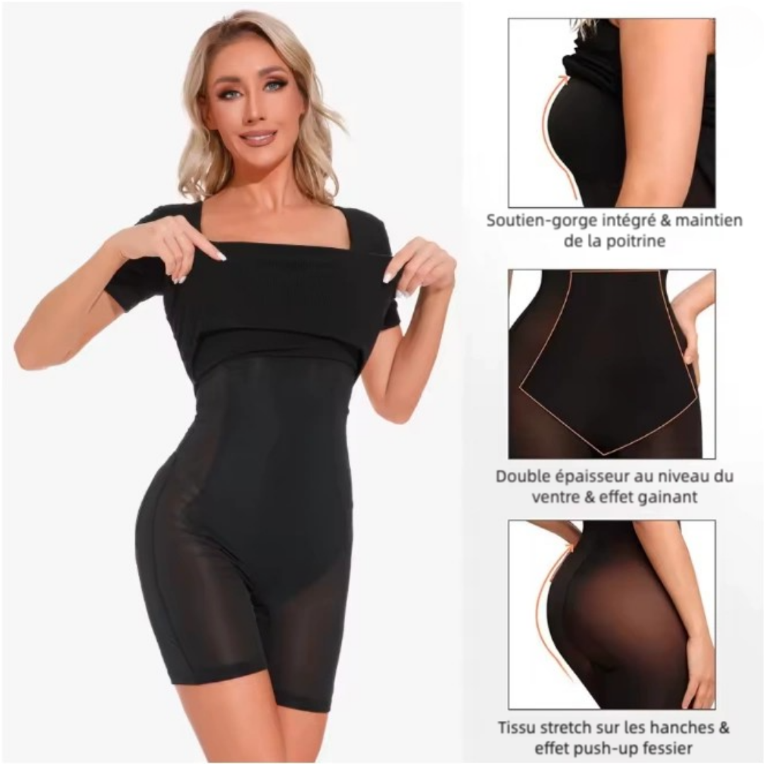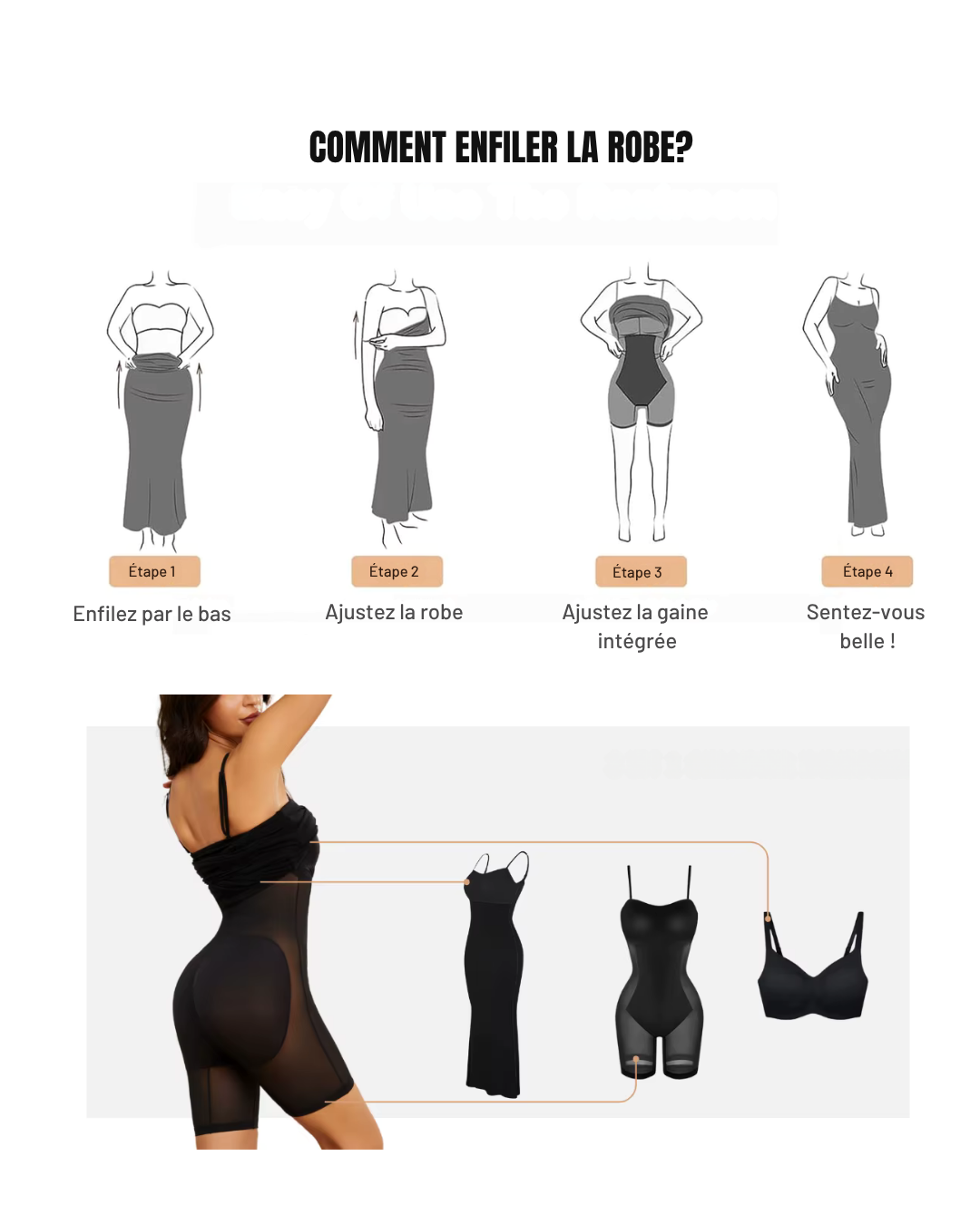 👉 Grâce à son système gainant intégré, elle épouse votre corps, marque votre taille, maintient votre ventre – le tout, sans jamais vous couper la respiration.